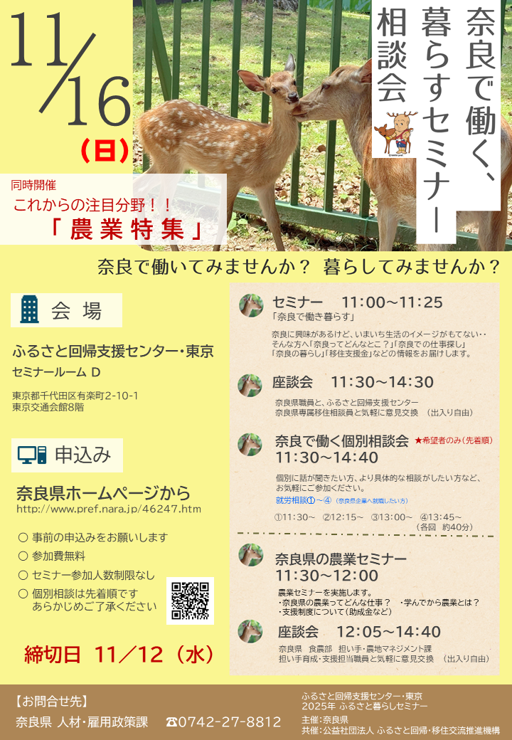 11/16(日)東京で奈良への移住に関する『奈良で働く、暮らすセミナー相談会』を開催します♪