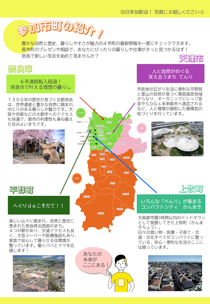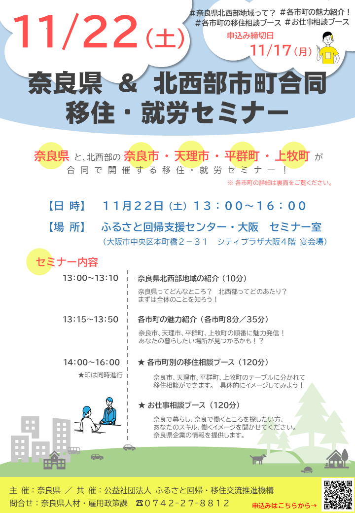 11/22(土) 大阪中心部にて、奈良県、そして県北西部に位置する奈良市・天理市・平群町・上牧町が合同で、移住・就労セミナーを開催します!
