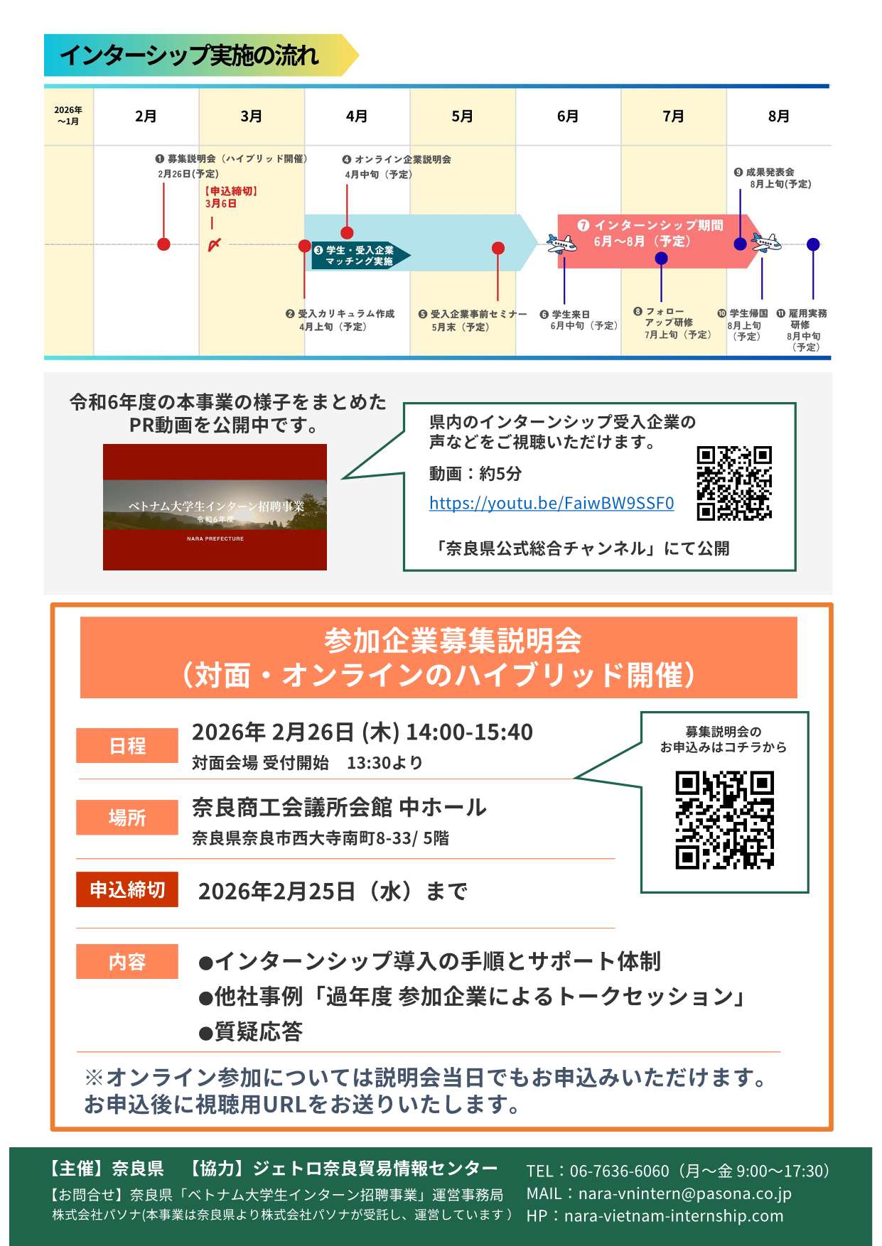 問合せ先: 奈良県「ベトナム大学生インターン招聘事業」運営事務局 株式会社パソナ